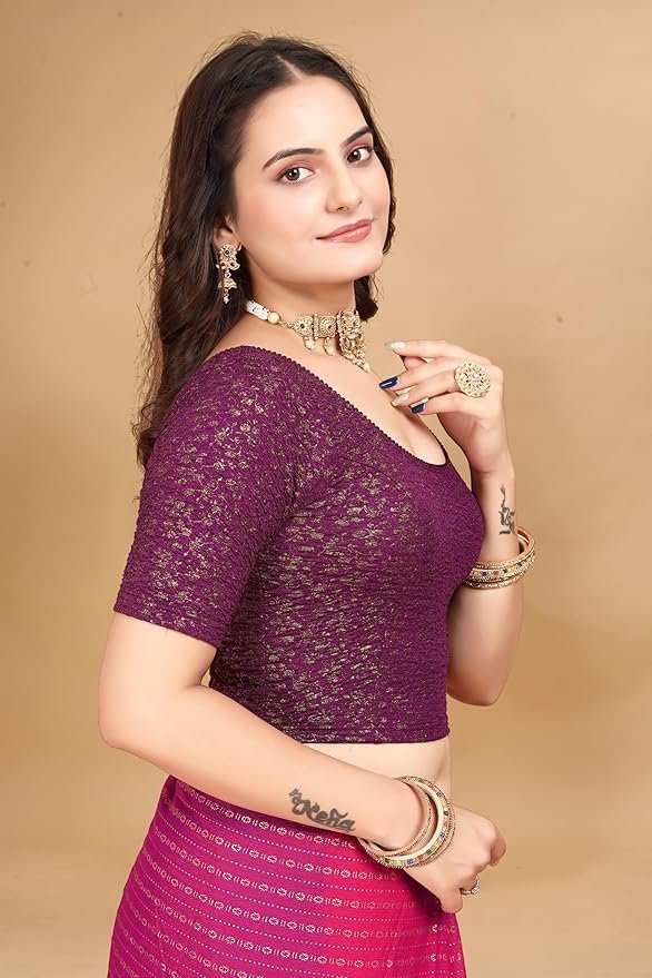 Round Neck Jacquard Elbow Sleeve Readymade Saree Blouse for Women Stylish